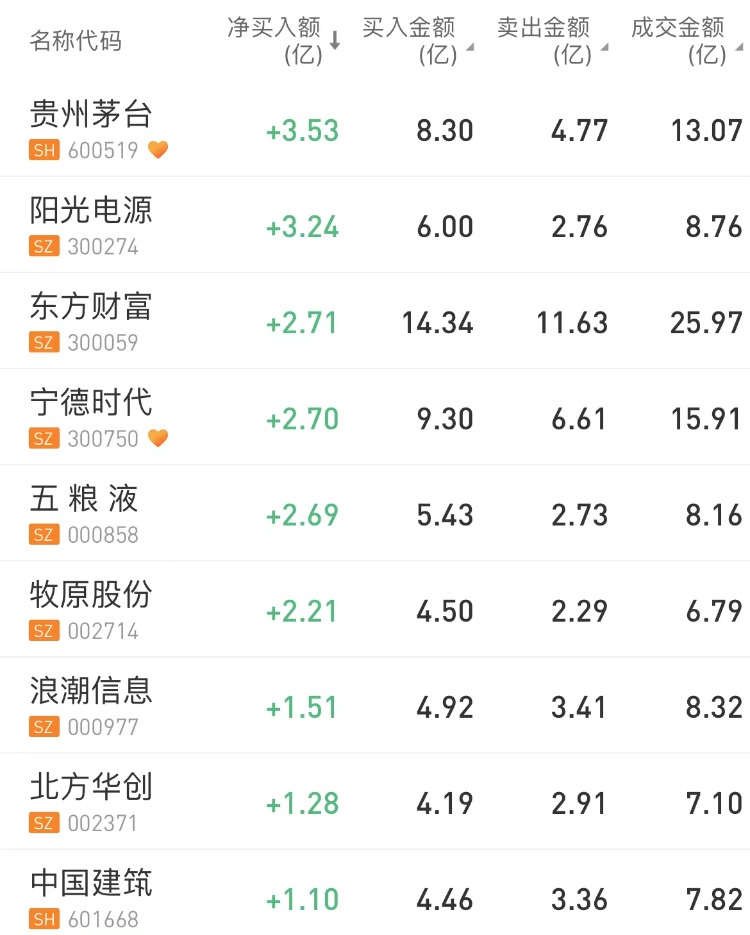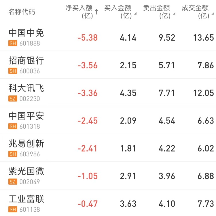 中国中免、招商银行、科大讯飞分别遭北向资金净卖出5.38亿元、3.56亿元、3.36亿元。贵州茅台获净买入额居首,金额为3.53亿元。