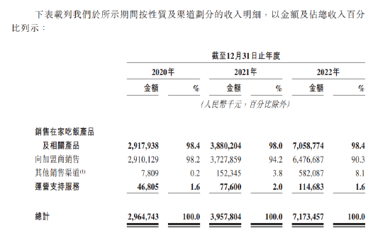按渠道收入来看,2020年至2022年,公司加盟店收入分别为29.1亿、37.28亿以及64.77亿,营收占比一直超过90%,一度占比高达98%。也就是说公,司业绩严重依赖加盟商,加盟门店表现的好坏直接对锅圈业绩产生重大影响。