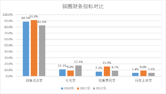 财报显示,锅圈总收益由2020年的29.65亿元增加33.5%至2021年的39.58亿元并进一步增加81.2%至2022年的人民币71.74亿元。同期,公司毛利分别为3.29亿元、3.55亿元以及12.49亿元,同比增幅分别为7.9%和251.5%。