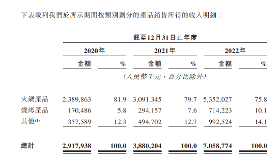 锅圈产品组合包括八大类别,包括火锅产品、烧烤产品、饮料、一人食、即烹餐包、 生鲜食品、西餐和零食,合共755个SKU,95%为“锅圈食汇”自有品牌产品。财报显示,火锅、烧烤为公司主要产品,且营收占比高达85%以上,火锅单品营收占比超过75%。