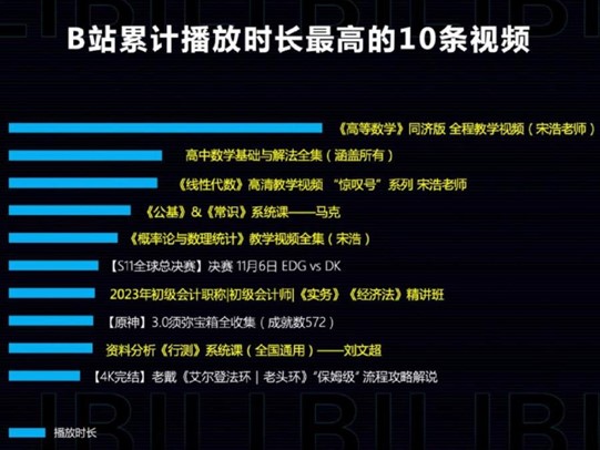在“感动中国2022年度人物·银发知播”13位获奖者中,有10位是B站UP主,包括中国科学院院士汪品先、华中师范大学教授戴建业、原中国科技馆馆长王渝生等。在B站累计播放时长最高的10条视频中,有7条是知识和课程类视频,包含高数、会计职称等多种内容。