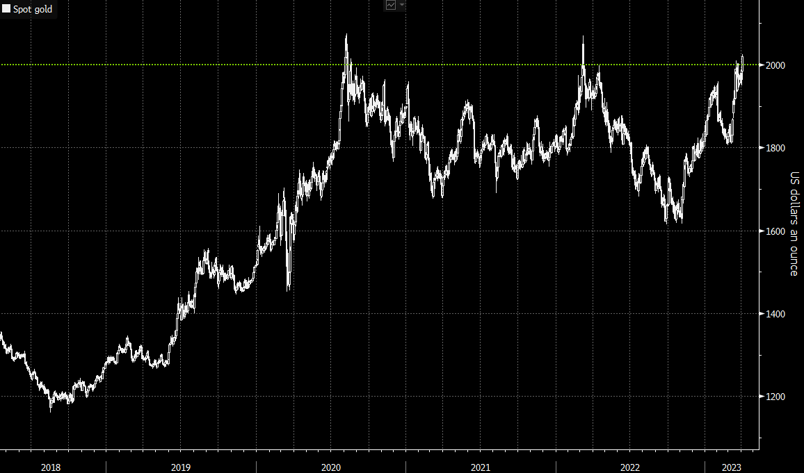 金价飙升至2022年3月以来的最高水平,此前公布的美国职位空缺数据更趋疲软,令市场预计美联储可能即将结束货币政策紧缩行动。美国2月职位空缺数下降至990万,创2021年5月以来的最低水平,暗示劳动力需求降温,但仍表明就业市场对美联储来说过于吃紧。对政策行动较为敏感的2年期美国国债收益率下滑,美元下跌。这利好黄金,金价一度上涨2%,至每盎司2024.95美元。StoneX Group分析师Fawad Razaqzada指出,突破2000美元关口后,金价可能进一步上涨,试探2020年8月触及的纪录高点2075.47美元。