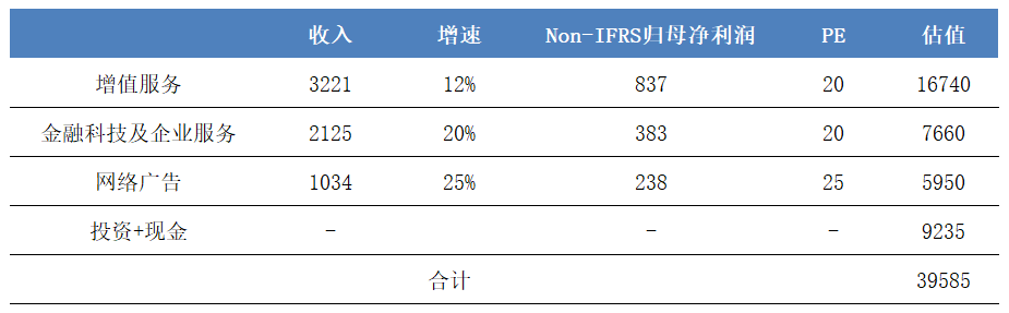 基于以上假设,我们选取细分领域的可比公司,用其估值系数的均值作为行业均值,同时,考虑到2023年宏观经济和流动性的回暖,在行业均值基础上调部分估值溢价,综合来看,分别给予增值服务/广告/金融科技与企业服务20/25/20倍的市盈率,由此测算出各业务分部对应的估值分别为16740/5950/7660亿元。