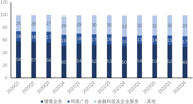 分业务看,22Q4 腾讯增值服务收入为 704.2 亿元,同比下降2%, 营收占比49%;网络广告收入为 246.6 亿元,同比增长 14.5%,营收占比 17%;金融科技及企业服务收入为 472.4 亿元,同比下降1.5%,营收占比32.6%;其他业务收入为 26.3 亿元,同比减少 5.9%,营收占比1.8%。