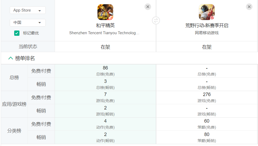 回顾2017-2019年间腾讯和网易的吃鸡大战。2017年,网易率先在《终结者 2》中加入吃鸡模式,然后推出荒野行动手游,占据了“吃鸡”赛道的先机,一度成为最受欢迎的吃鸡游戏;但2019年和平精英上线后凭借社交优势快速抢占了“吃鸡”赛道的用户和市场。截至2022年,和平精英一直维持在 IOS 畅销榜前五名,但荒野行动早已不见踪影。