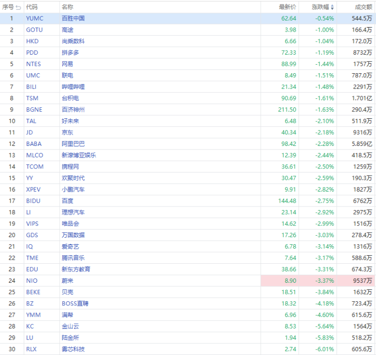 华盛资讯4月5日消息,3倍做空富时中国50指数ETF $YANG 涨4.38%;纳斯达克中国金龙指数跌2.78%。热门中概股普跌,截至发稿,拼多多、百济神州,台积电、哔哩哔哩跌超1%;百度、京东、阿里巴巴跌超2%;腾讯音乐、贝壳跌超3%;金山云、陆金所跌超5%。中概教育股走低,新东方教育跌超3%、好未来跌超2%,高途跌超1%。