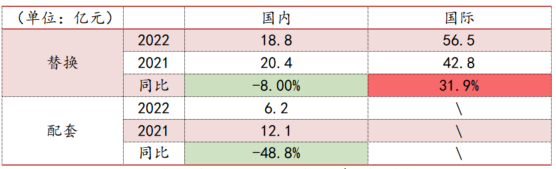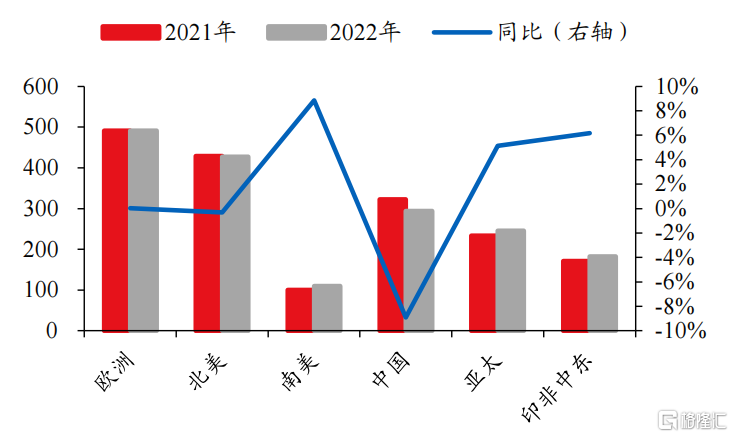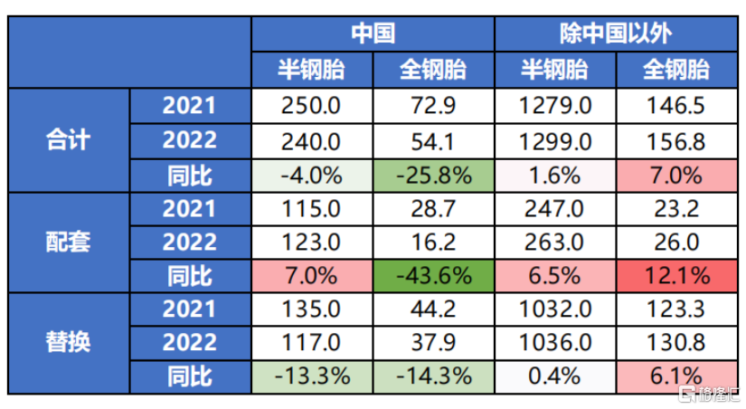 轮胎是重要的汽车安全件,且显著影响整车性能。从全球视角来看,去年轮胎市场需求总体平稳。根据米其林年报统计,2022年全球汽车轮胎(全钢+半钢)销量17.49亿调,同比增加0.03%。分区域看,海外稳中有升,国内受疫情拖累下降(如下图)。据米其林统计,2022年中国市场轮胎销量共2.94亿条,同比减少8.9%,其中半钢胎和全钢胎销量分别为2.40和0.54亿条,同比下降4.0%、25.8%。