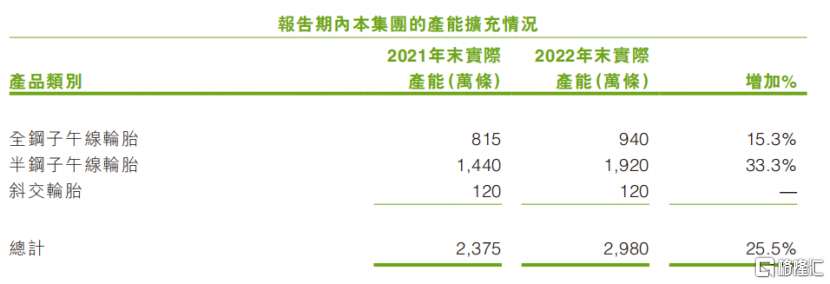 三是产能端,浦林成山于2022年末实际产能达2980万条,同比增长25.5%。其中,半钢胎同比增加33.3%达1920万条,占总产能约64.4%。