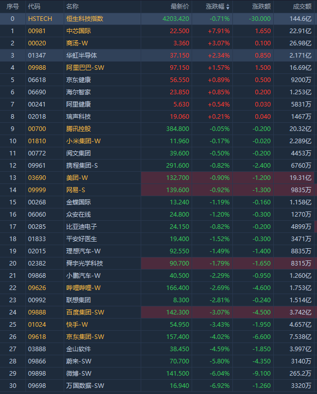 其他成分股,万国数据跌近7%,金山软件跌超4%;商汤涨超3%,京东健康、阿里健康涨近1%。