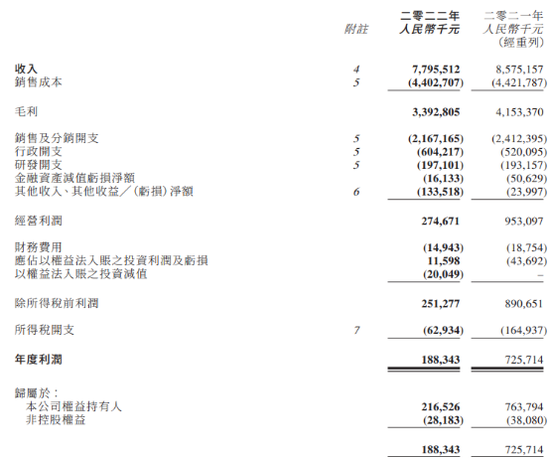 年报显示,2022年,澳优实现收入约77.96亿元人民币(下同),同比减少9.1%;经调整后归属于母公司权益持有人应占利润约4.72亿元,同比减少39.8%;公司权益持有人应占利润2.165亿元,同比减少71.7%。