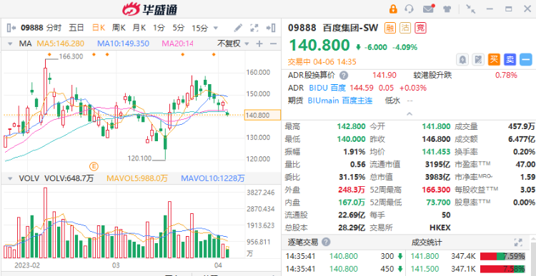 早前已发布AI聊天机械人“文心一言”的百度 $09888.HK 则显着受压,股价今回试140港元水平,失守20及50天平均线。