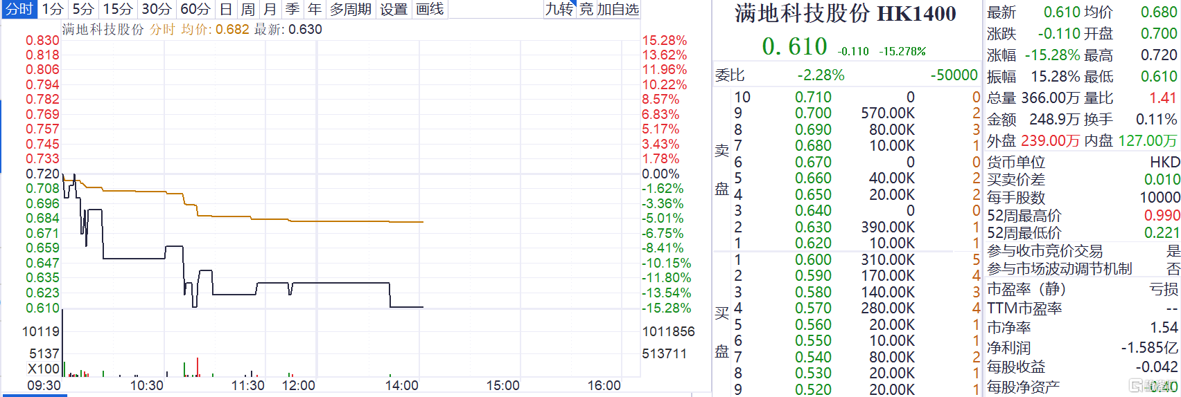 格隆汇4月6日丨满地科技股份(1400.HK)跌超15%,报0.61港元,总市值20亿港元。满地科技股份近期公布2022年年度业绩,公司实现收益同比减少约41.8%至9050万元,股东应占亏损同比增39.8%至1.4亿元,每股基本亏损约2.16元。亏损增加主要由于本年度受汇率波动影响,以港元计值的债券本金及利息约人民币9.13亿元产生汇兑亏损净额约人民币5820万元。