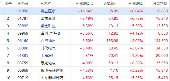 截至A股收盘,AH股涨幅前10如下: