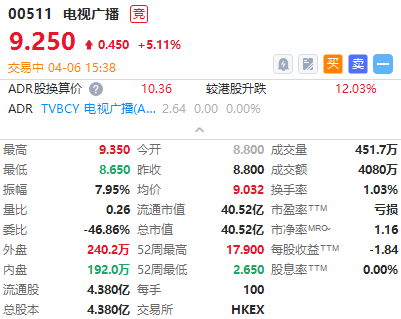 电视广播(00511)尾盘涨超5%,截至发稿,涨5.11%,报9.25港元,成交额4080万港元。