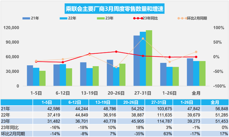 据乘联会初步统计,3月1-31日,乘用车市场零售159.6万辆,同比持平,较上月增长17%。今年以来累计零售427.5万辆,同比下降13%;全国乘用车厂商批发195.5万辆,同比增长7%,较上月增长22%。今年以来累计批发502.1万辆,同比下降8%。初步统计,3月1-31日,新能源车市场零售54.9万辆,同比增长5%,较上月增长27%。今年以来累计零售131.9万辆,同比增长15%;全国乘用车厂商新能源批发59.9万辆,同比增长32%,较上月增长21%。今年以来累计批发148.3万辆,同比增长24%。