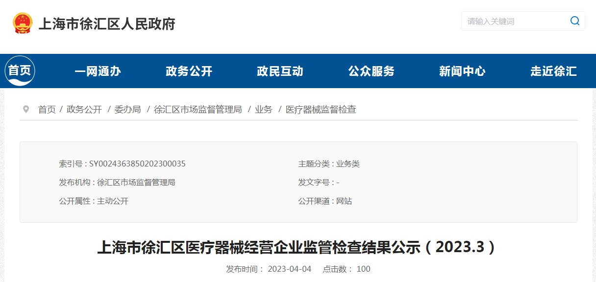 中国质量新闻网讯 4月4日,上海市徐汇区市场监管局公示医疗器械经营企业监管检查结果(2023.3)。