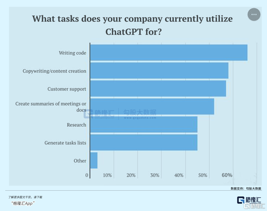 据《财富》对1000家企业的调查。目前美国有50%的企业已经在使用ChatGPT,30%有计划使用。而在已经使用ChatGPT的企业中,48%已经让其代替员工工作。