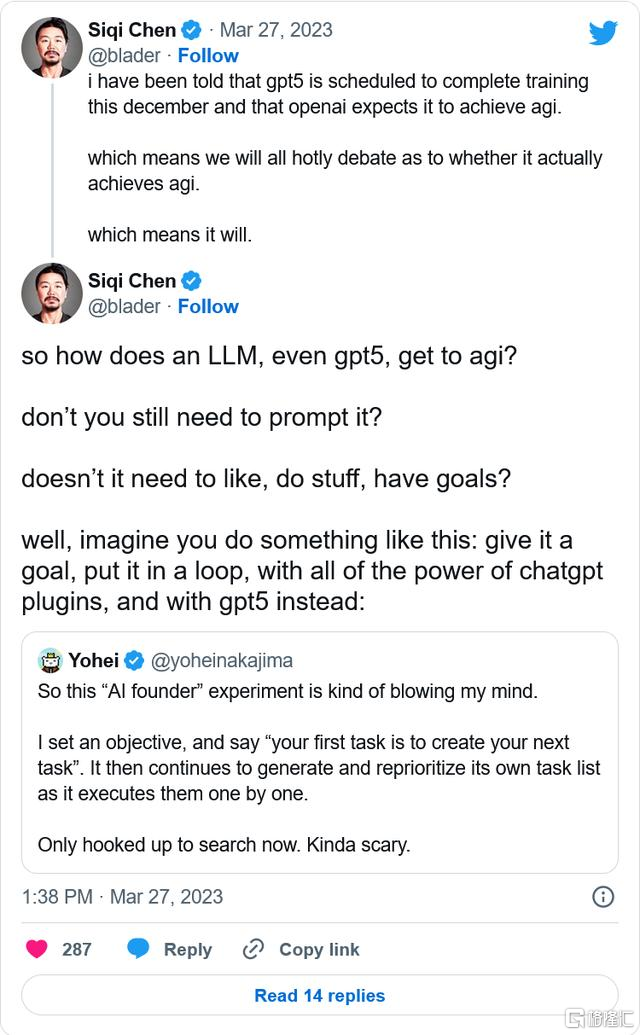 据开发人员SiqiChen爆料,GPT-5将在12 月完成训练,有希望实现AGI通用人工智能。