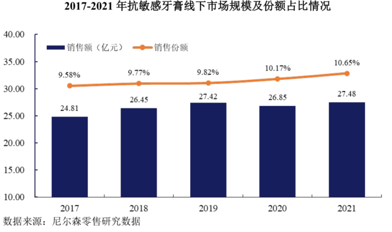 根据尼尔森零售研究数据显示,2017-2021年,抗敏感市场份额持续增长,且增速高于牙膏行业整体和美白、牙龈护理细分品类。2021年我国线下渠道抗敏感牙膏市场零售规模达27.48亿元,增幅2.35%快于牙膏品类线下整体,是口腔清洁护理用品行业细分市场中增长较快的品类,已成为牙膏品类中第三大线下细分市场,市场份额占比达到10.65%。