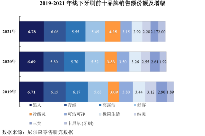 根据尼尔森零售研究数据,作为口腔清洁护理用品中第二大品类的牙刷领域,冷酸灵品牌牙刷2021年线下市场零售额市场份额占比提升至4.25%,并作为前十品牌中市场份额连续增长的两个品牌之一,以21.06%的同比高增速挺进行业第五、本土品牌第三。