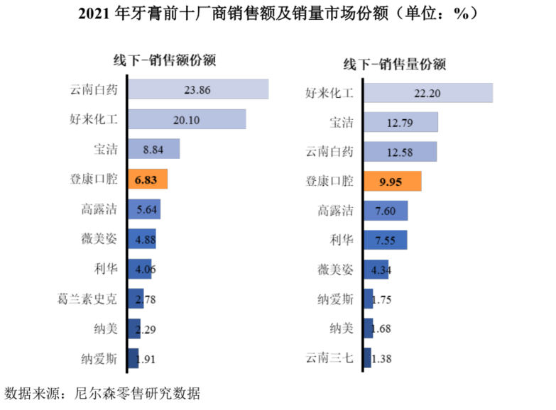 根据尼尔森零售研究数据,最大口腔清洁护理品类的牙膏领域,登康口腔2021年线下销售渠道零售额市场份额占比为6.83%、销量市场份额占比9.95%,行业排名位居第四、本土品牌第二。