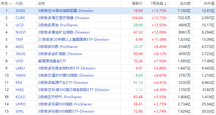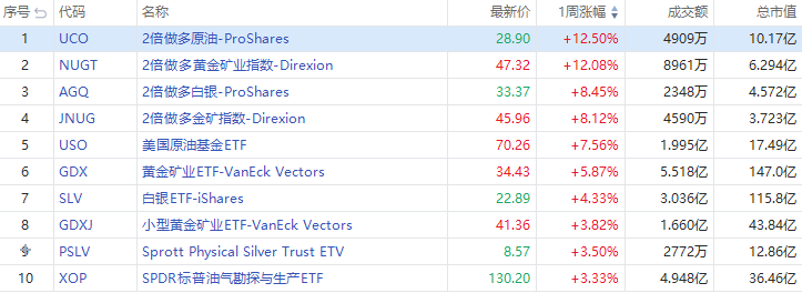 从ETF涨幅榜来看,做多原油、黄金等大宗商品的ETF走高。具体来看,2倍做多原油ETF $UCO 周涨12.5%,2倍做多黄金矿业指数-Direxion $NUGT 周内涨超12%,周内交投活跃。