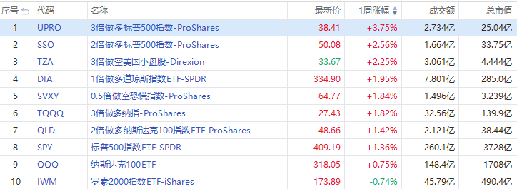 相关ETF同步上扬,3倍做多标普500指数ETF $UPRO 近一周微涨3.75%列股指涨幅榜第一,2倍做多标普500指数ETF $SSO 微涨2.56%;3倍做多纳指ETF $TQQQ 涨1.82%,2倍做多纳斯达克100指数ETF $QLD 、标普500指数ETF $SPY 近一周均涨逾1%。纳斯达克100ETF $QQQ 跟涨。