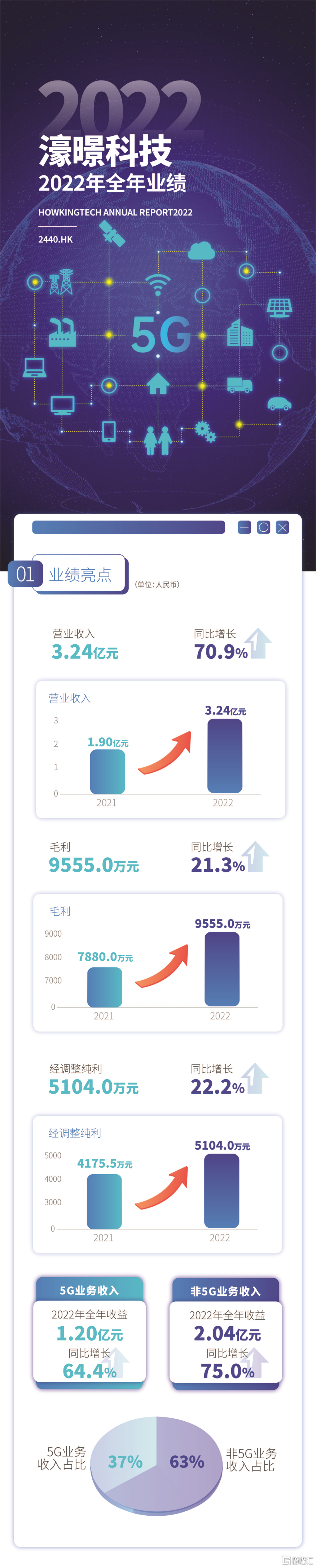 濠暻科技(2440.HK)公布业绩显示,2022年收益3.24亿元人民币,同比增长70.9%。其中,2022年5G业务收益同比增长64.4%至1.198亿元;非5G业务同比增长75%至2.042亿元。公司2022年经调整纯利5104万元,同比增22.2%。