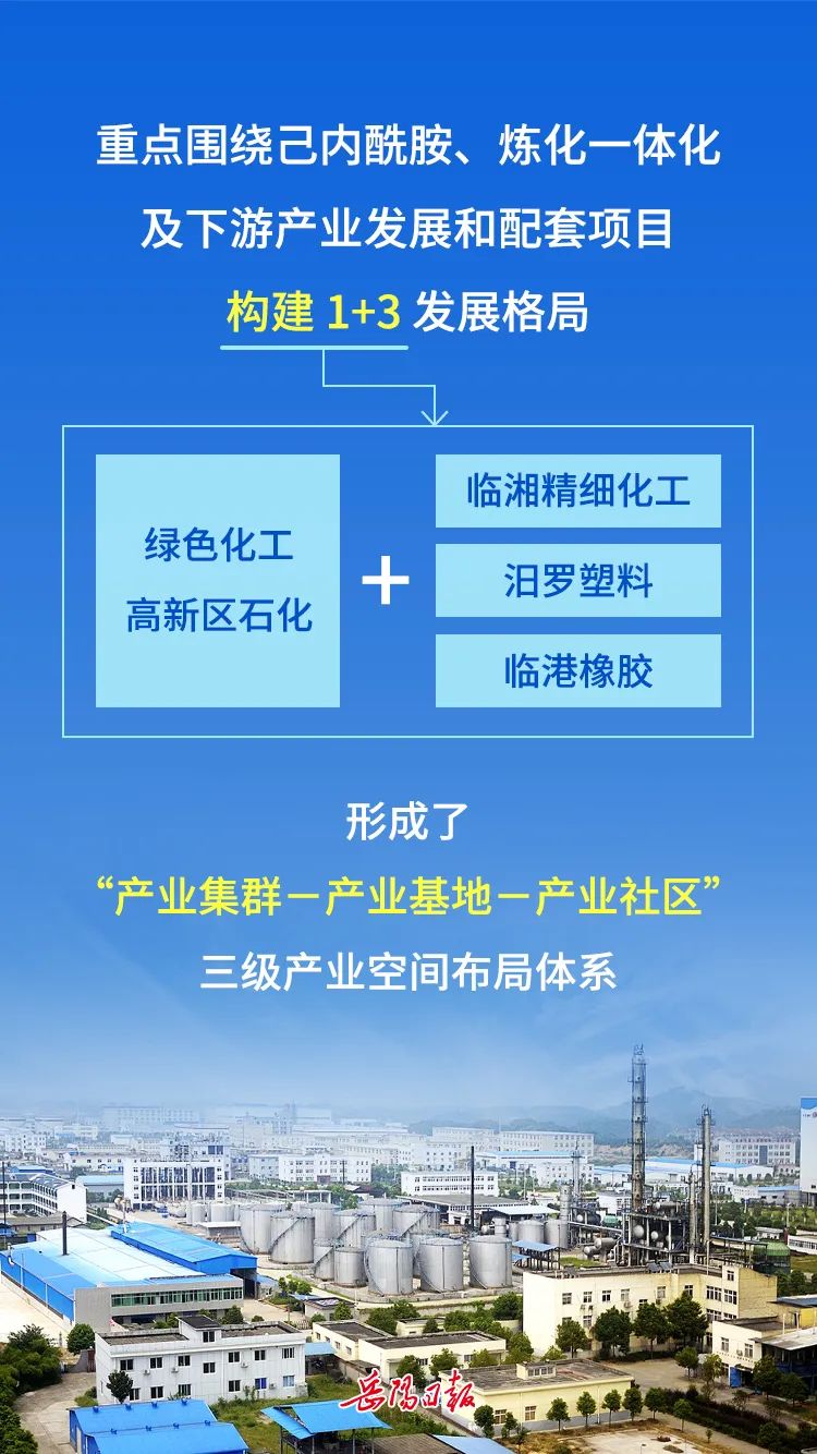 一、注重规划引领。始终坚持以石油化工产业特色编制产业发展规划,放眼全局和长远,重点围绕己内酰胺、炼化一体化及下游产业发展和配套项目,构建1+3(绿色化工高新区石化+临湘精细化工、汨罗塑料、临港橡胶)发展格局,形成了“产业集群-产业基地-产业社区”三级产业空间布局体系。