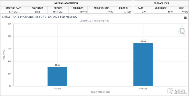 CME“美联储观察工具”显示FOMC在5月继续加息的概率蹿升至七成。