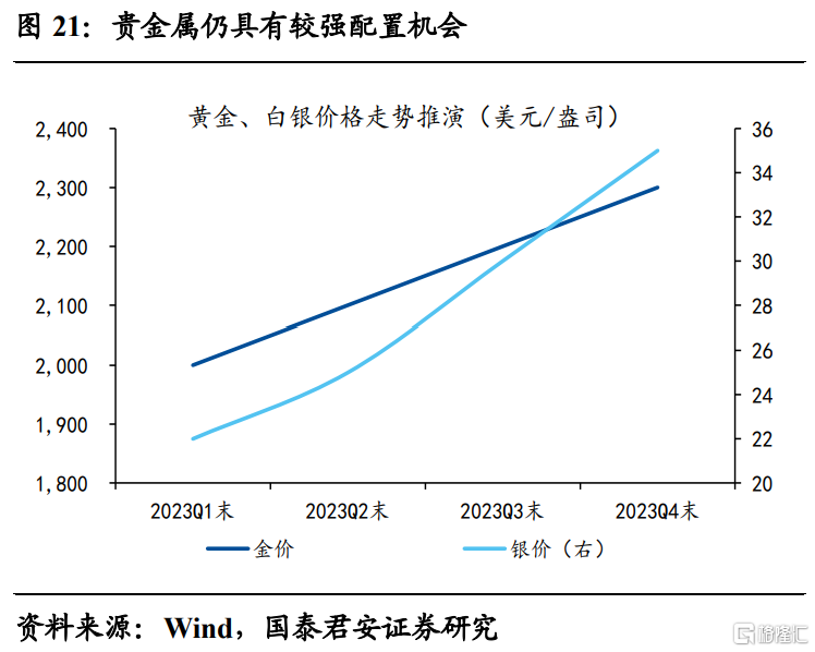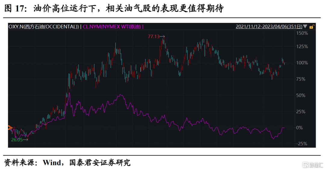 3.高油价下,相关油气股的表现值得期待,金银的投资机会仍需重视。以往来看,油价跟油气股价走势高度相关。但在2022年6月油价开启跌势后,油气股价的走势非常稳健,甚至还阶段性创出新高,背后的玄机值得深思。以巴菲特购买西方石油为例,并非意味着看多油价,而是对供给收缩下资源产能价值的重估。高油价稳住通胀预期,再结合衰退趋势下名义利率仍处于下行通道,贵金属仍具有较强配置机会。
