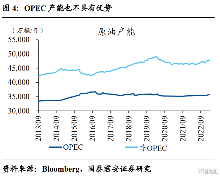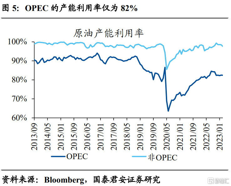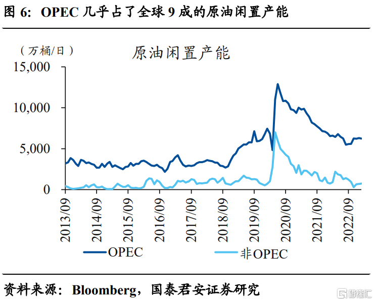 何为原油的定价权?既不是产量也不是产能,其实是闲置产能。单看产量而言,OPEC整体原油产量大约在3000万桶/日,约占世界总产量的三成左右,远远谈不上支配原油生产秩序。即便看产能,OPEC也没有左右油价的能力。不过,考虑到非OPEC国家的原油产能利用率接近100%,反观OPEC的产能利用率仅为82%。从闲置产能(产能-产量)的角度出发,OPEC几乎占了全球9成的原油闲置产能,这也是OPEC减产的最大底气所在。