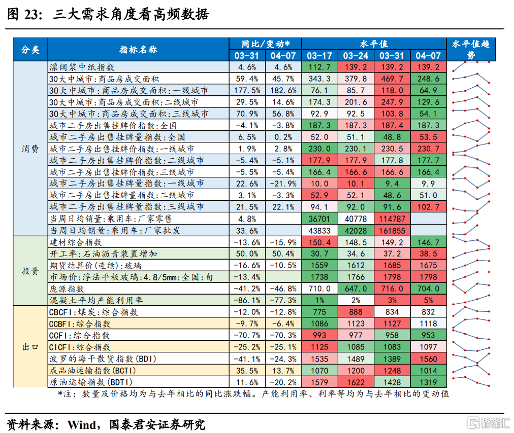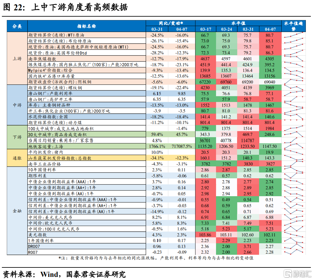 下游:30大中城市商品房成交面积和上海地铁客运量出现下跌,100大中城市成交土地面积持续上升。4月7日当周,30大中城市商品房成交面积和上海地铁客运量均呈现出大幅下跌,100大中城市成交土地面积连续三周持续上升。