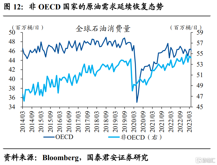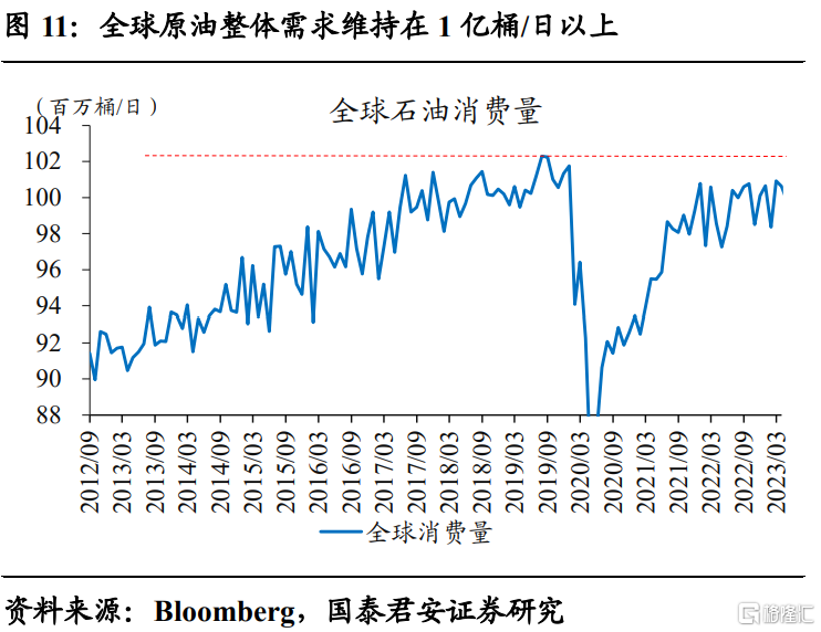 需求端,原油需求在出行端景气的支持下相对稳固,但依然面临衰退的“压力测试”。原油7成左右的需求集中在汽车、飞机、轮船等出行端,与全球服务业景气度高度相关。2022年以来,全球原油整体需求维持在1亿桶/日以上。尤其是在中国等经济体经济重启的提振下,原油供需维持紧平衡。展望未来,考虑到美国等经济体的经济下行趋势仍没有结束,原油需求端是否延续稳态,可能将面临一场“压力测试”。