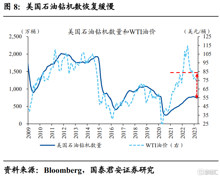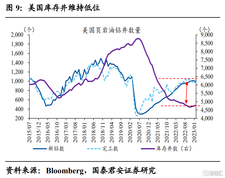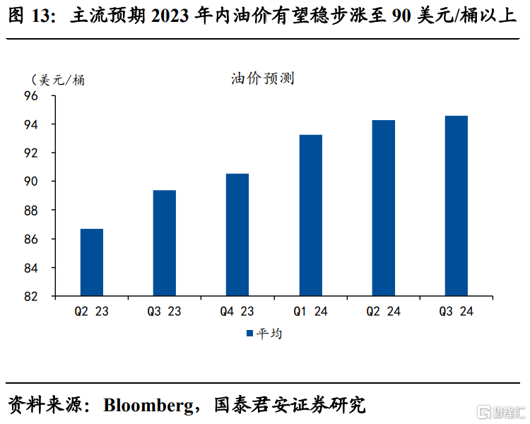 2.衰退阴影下,2023年油价展望:80美元/桶或是常态,波动率抬升更值得留意。作为原油市场的另一个“重磅玩家”,美国原油增产缓慢,石油钻机数量仅仅增长到590个,距离巅峰期的2000个左右相差甚远,同时库存井数量已不足5000个,意味着页岩油的产能约束将持续存在。美国SPR(战略石油储备)过低,已经威胁到能源安全问题,持续大规模去库的概率极低。需求端,考虑到美国等经济体的经济下行趋势仍没有结束,原油需求端是否延续稳态,可能将面临一场“压力测试”。主流机构的预测显示,2023年内油价有望逐季上涨至90美元/桶以上。我们认为,这一轮衰退是“产能约束下的衰退”,即便美欧发生深度衰退,油价可能再度回落到70美元/桶附近,进一步回落到60甚至50美元/桶的风险有限。同时,若中东、俄乌等地缘局势再度紧张,直接影响到原油供给端,油价短期破百也不是没有可能。因此我们认为,2023年油价波动率中枢的抬升更值得留意。