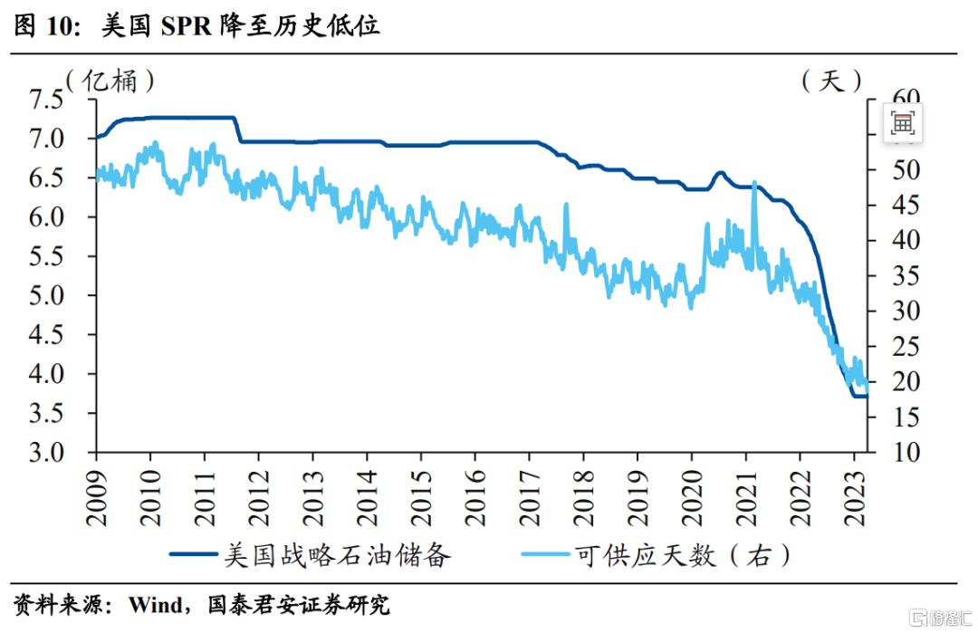 美国SPR(战略石油储备)过低,已经威胁到能源安全问题。2022年油价见底,除了需求端预期走弱,也离不开SPR库存的大幅去化。数据显示,SPR从高位的6.3亿桶左右去化至3.7亿桶,相当于可支撑美国原油消费的天数不足20天。考虑到能源安全问题,SPR持续大规模去库的概率极低。