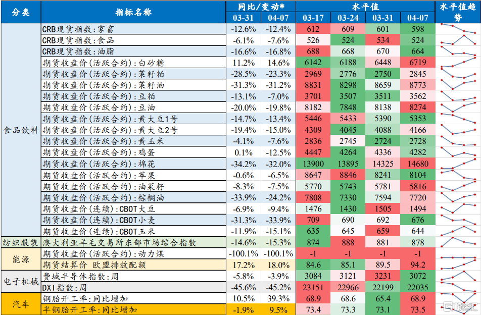农产品现货价格整体下跌,期货价格大多出现上涨趋势。4月7日当周,从CRB现货价格来看,家畜、食品和油脂价格整体下降;从期货收盘价来看,大豆、玉米、鸡蛋、苹果和玉米有所下降,其余食品价格较上周均呈现上涨趋势。