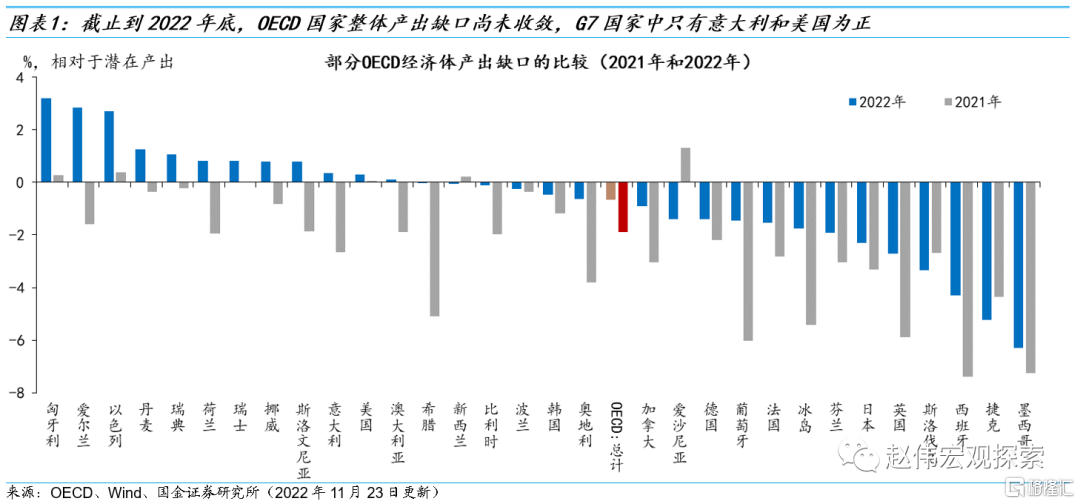 分国家而言,结构特征为:小国好于大国,北美好于欧洲。参考OECD的测算,2022年产出缺口转正的国家有:匈牙利、爱尔兰、以色列、丹麦、瑞典、荷兰、瑞士、挪威、斯洛文尼亚、意大利、美国和澳大利亚(按照产出缺口由高到低排列)——G7国家中只有意大利和美国为正,其余5国(加拿大、德国、法国、日本和英国)均为负值。