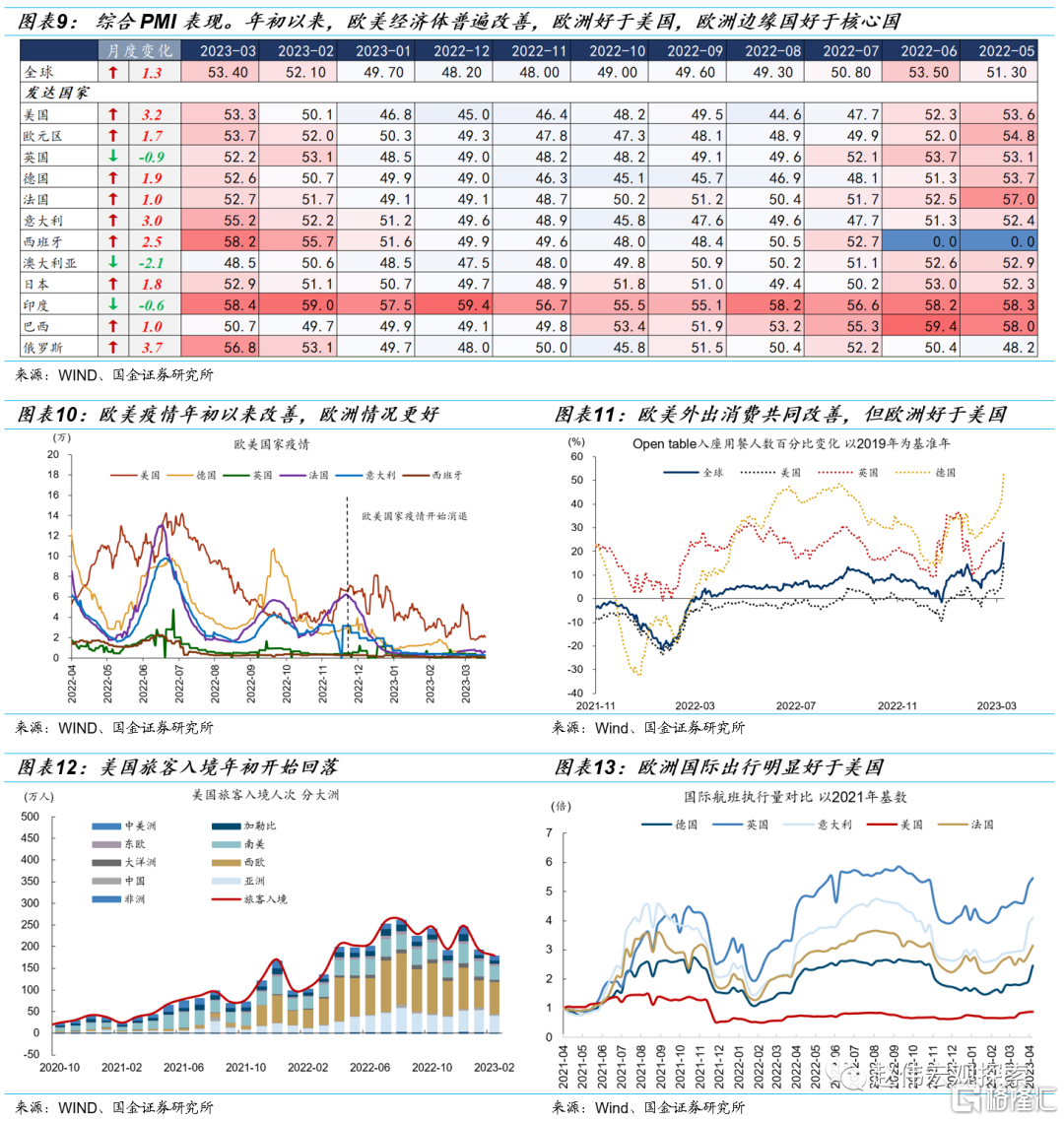 国家层面,海外年初以来的经济反弹呈现出欧洲好于美国,欧洲边缘国好于核心国的特征,主因是疫情改善,出行修复,欧洲暖冬及美国寒潮影响。近五个月,欧元区综合PMI均高于美国,欧元区内部,意大利、西班牙等欧洲国家改善程度好于德、法两大核心国。原因有几点:一是,2022年12月后欧美疫情共同改善,新增病例明显回落,欧洲地区疫情情况好于美国,欧洲边缘国疫情又好于核心国。当前欧洲未见反弹,但美国新增病例3月中旬仍反弹至每日新增4万人;二是国内服务消费方面,欧美国内出行、场景消费情况共同改善,外出用餐人数均回升,欧洲好于美国。三是国际服务消费方面,受欧洲暖冬与美国寒潮影响,欧洲国际出行情况明显好于美国,欧洲国际航班执行数量改善幅度较大,美国则仍回落,且美国旅客入境量年初以来仍下滑。