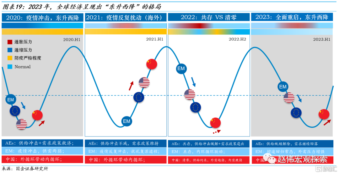 在2023年全球经济展望中,我们从“周期的冲突”的视角,总结了2020年以来全球经济基本面的演绎逻辑,并将2023年全球经济的动态归纳为“东升西降”。2020年以来,由于疫情扩散足迹、防疫政策严格程度和逆周期政策强度(及支出结构)等方面的差异,全球经济周期的冲突是后疫情时代把握全球大类资产演绎的一条逻辑主线。