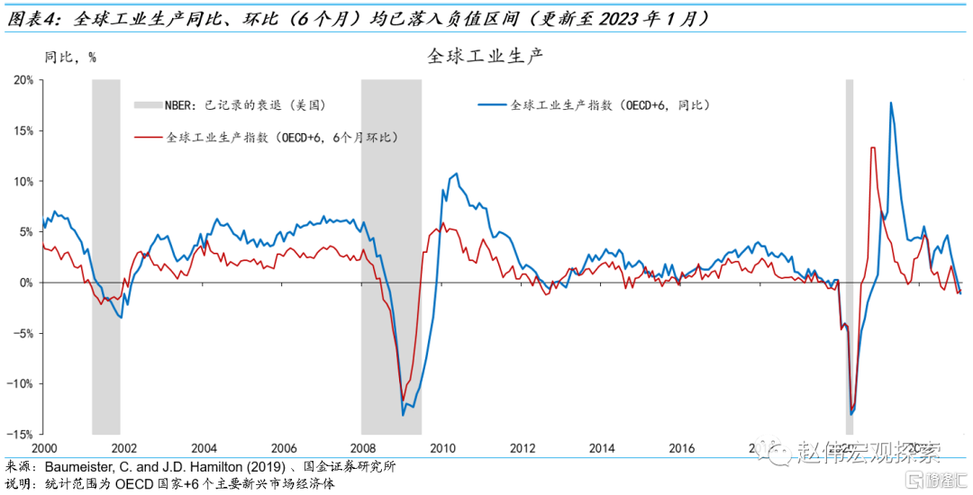 后疫情时代,不同经济部门的复苏呈现出错位和分化的特征:先制造,后消费。2022年疫情防控措施逐步解除后,海外经济整体仍延续复苏态势,但下半年开始,制造业与服务业呈现出“冰火两重天”的特征——前者持续收缩,后者持续扩张。参照OECD实际GDP高频跟踪数据[1],1季度OECD实际GDP增速仍将维持高位(2.5%,同比),较2022年4季度上行约0.8个百分点。从服务业和制造业PMI数据可以看出,这主要与服务业维持高景气有关。就全球而言(OECD+6个主要新兴市场国家),制造业同比和6个月环比均已经落入负值区间。