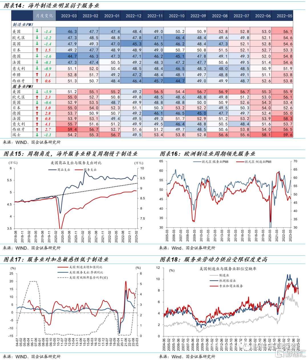 从海外修复的产业结构上看,服务业反弹明显好于制造业,欧美服务业普遍走强,制造业仍然走弱,主因源自疫后周期错位、加息敏感性不同及劳动力修复节奏作用。美国、欧元区近半年制造业PMI分别回落至46.3和47.3,服务与制造业分化的格局加大,造成这种结构型修复的主因有三:第一,周期角度上,疫情后服务业的修复进度慢于制造业,截至2023年3月,美国服务业消费仍未弥补缺口,但商品消费已进入下行周期。第二,服务业对加息的敏感性低于制造业,美国近两次加息周期里,服务消费的回落程度均低于制造业。第三,服务业受劳动力供应节奏影响更大,服务业作为场景消费替代渠道更少,疫情后服务业职位空缺率较制造业明显扩大,使得服务业修复慢于制造业。