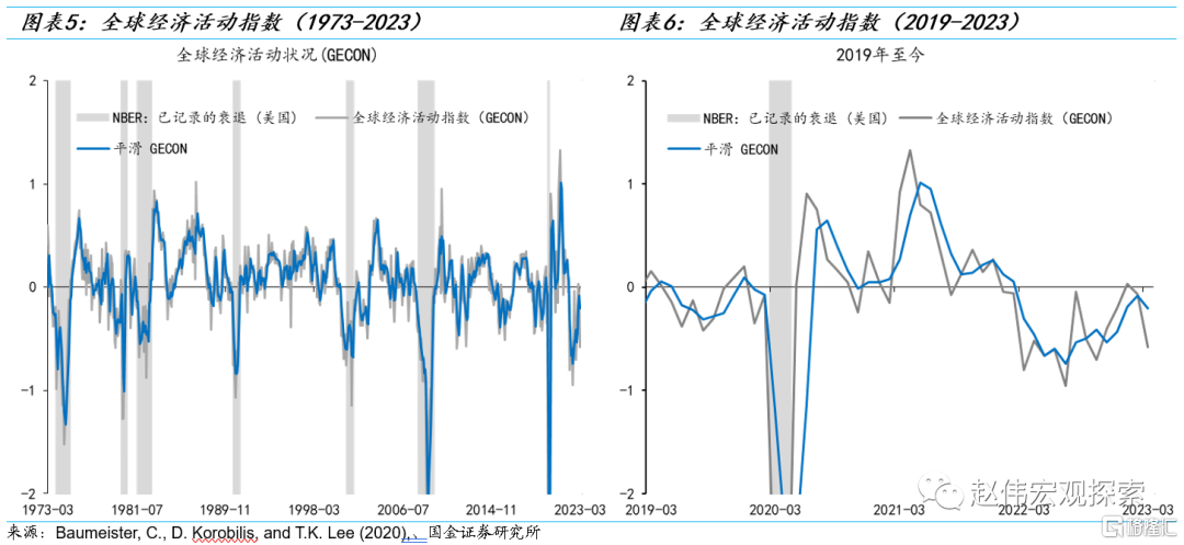 全球经济活动指数(GECON)显示,始于2022年3季度的全球经济复苏进程正面临挑战。Baumeister et al.(2020[2])精选了16个底层指标,运用主成分分析方法(PCA)构建了全球经济活动指数(Global Economic Conditions indicator,GECON),以解释并预测能源需求,反映全球真实经济活动状况。GECON的底层指标中除了OECD+6个新兴市场国家的工业生产指数以外,还有谘商会经济领先指标,OECD信心调查数据等,此外还包括金融条件、交通、气候、预期和能源生产和发电相关的指标,所以更加综合。GECON能够充分反映2022年3季度以来全球经济的修复,但也能看出,3月开始触顶向下。