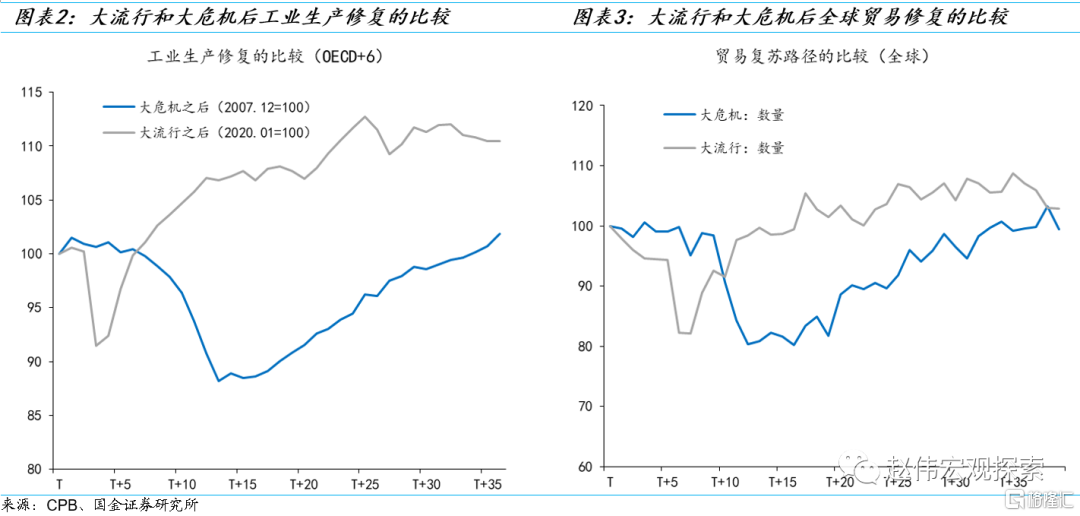 从工业生产和贸易规模两个维度比较,大流行后全球经济修复的弹性较2008年大危机之后明显更强,但持续性更差。2008年大危机和2020年大流行后,全球工业生产指数回到危机前所用的时间分别为34个月和7个月。贸易规模指数回归的时间分别为38个月和17个月。所以,后疫情时代工业生产和贸易修复的弹性更强。但从持续性看,结论正好相反——大流行的持续性更弱。大流行后,工业生产和全球贸易规模修复的高点位于第25个月(2022年2月)和第32个月(2022年6月)。大危机后仍维持修复态势。