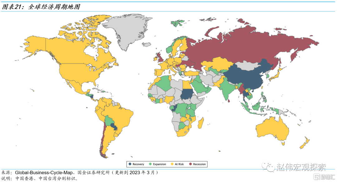 在2023年全球经济展望中,我们将全球经济的动态特征归纳为“东升西降”。截止到2023年3月,东升西降的格局越来越清晰。在主要大国中,中国处于经济周期中的“复苏”阶段;印度处于“扩张”阶段;而美国、加拿大、德国、法国、澳大利亚均处于从放缓到衰退的过渡阶段(at risk)。英国和俄罗斯已经处于“衰退”阶段。所以,今年全球经济增长的主要拉动力量来自东方,而西方则会拖累全球经济增长。