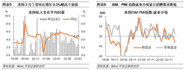美国3月工资同比增速回落创2021年6月以来新低,但环比增速有所回升。美国3月非农平均时薪为33.18美元,同比增长4.2%,低于预期4.3%和前值4.6%,并创2021年6月以来新低;环比增长0.3%,持平于预期但高于前值0.2%;同时,非农非管理人员平均时薪同比为5.1%,低于前值5.3%。2022年下半年以来,非农非管理人员工资同比增速与当月PCE物价同比较为接近,因此经验上预计3月美国PCE同比或在5.1%左右。