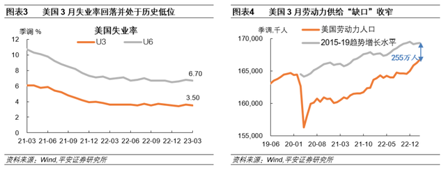 美国3月失业率回落至3.5%,劳动参与率再度回升0.1个百分点。美国3月U3和 U6失业率较前值3.6%和6.8%均回落0.1个百分点,分别至3.5%和6.7%。3月劳动参与率再度回升0.1个百分点至62.6%,对应新增劳动力48万人,是2022年平均水平的2.25倍,自2022年底以来劳动力人口持续修复。劳动力供给方面,3月美国劳动力人口为1667.3万人,较2015-2019趋势增长水平低255.3万人,缺口已连续四个月收窄。