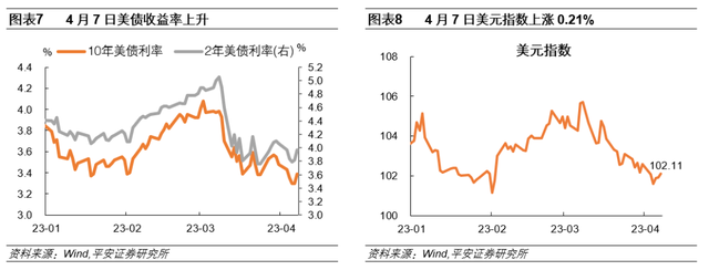 就业数据公布后,美债收益率上涨,美元指数上行。4月7日,10年美债收益率由前值3.30%小幅上涨9BP,至3.39%;2年美债收益率上涨15BP,至3.97%;1年美债收益率上涨10BP,至4.61%。非农报告公布后,美股期货止跌转涨,道指和标普500指数期货均涨0.2%,纳斯达克100期货涨0.1%;美元指数立即跃升,涨幅近0.4%,但收盘回落至0.21%,重上102关口。