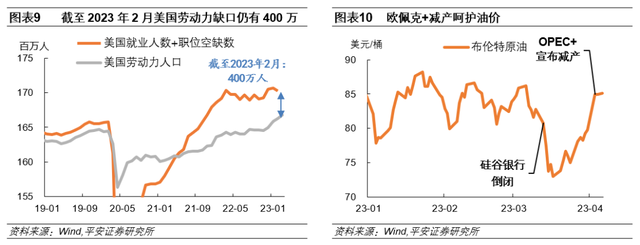 美国3月就业数据公布后,市场对5月加息25BP的预期升温。据CME FedWatch,4月7日就业数据公布后,市场对5月美联储加息25BP的预期由49.2%跃升至67%左右,但仍预计下半年将降息75BP左右。虽然市场认为招聘市场已经出现疲软信号,但劳动供求缺口仍大、失业率居“低”不上,叠加原油价格再度上行和银行业危机暂时缓解,美联储加息的必要性和可行性都更充分。