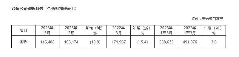 2023年3月合并营收约为新台币1454亿元,较上月减少了10.9%,而较去年同期减少了15.4%。